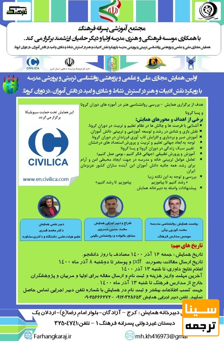 سینا ترجمه: اولین همایش مجازی ملی و علمی و پژوهشی روانشناسی تربیتی و پرورشی مدرسه با رویکرد نقش ادبیات و هنر در گسترش نشاط و شادی و امید در دانش آموزان، در دوران کرونا روز سه شنبه، 16 آذر، 1400 توسط دبستان غیردولتی پسرانه فرهنگ 1, موسسه فرهنگی و هنری مدرسه اولیا به صورت آنلاین برگزار می شود.