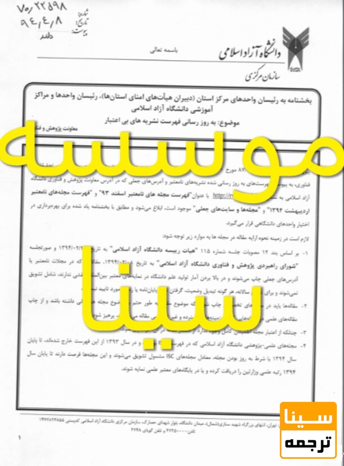 سینا ترجمه: فهرست جدید نشریه های نامعتبر از سوی وزرات علوم ، تحقیقات و فناوری ابلاغ شده و برای بهره برداری در اختیار واحد های دانشگاهی قرار گرفته است.