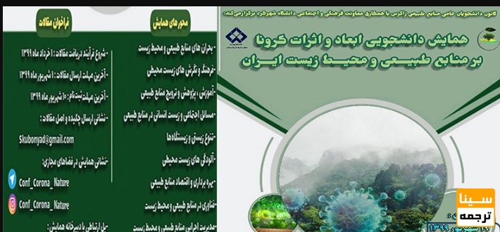 سیناترحمه:همایش دانشجویی ابعاد و اثرات کرونا بر منابع طبیعی و محیط زیست ایران در تاریخ 29 آبان 1399 تا 29 آبان 1399 توسط دانشگاه شهرکرد, دانشگاه شهرکرد - بنیاد حامیان منابع طبیعی زاگرس در شهر شهرکرد برگزار می شود.