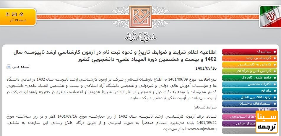 سینا ترجمه: مهلت ثبت نام آزمون کارشناسی ارشد 1402 از تاریخ 1401/09/16 لغایت 1401/09/22