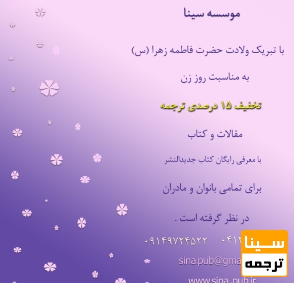 سیناترجمه:موسسه سینا به مناسبت میلاد حضرت فاطمه (س) و روز مادر برای گرامی داشت بانوان عزیز تخفیف ترجمه مقاله و کتاب ( با معرفی رایگان کتاب) در نظر گرفته است.