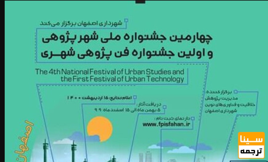 سینا ترجمه :چهارمین جشنواره ملی شهرپژوهی و اولین جشنواره فن پژوهی شهری روز سه شنبه، 28 اردیبهشت، 1400 لغایت چهارشنبه، 29 اردیبهشت، 1400 توسط شهرداری اصفهان در شهر اصفهان برگزار می شود.