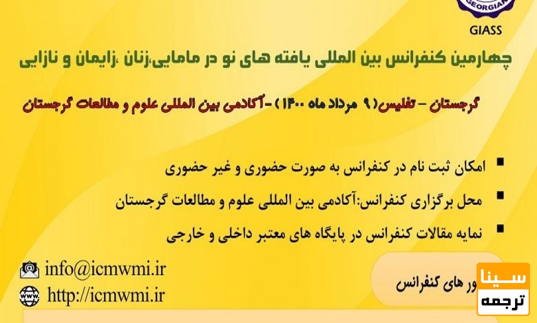 سینا ترجمه: چهارمین کنفرانس بین المللی یافته های نو در مامایی، زنان ،زایمان و نازایی روز شنبه، 9 مرداد، 1400 توسط آکادمی بین المللی علوم و مطالعات گرجستان در شهر گرجستان-تفلیس برگزار می شود.
