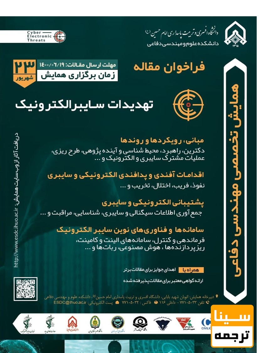 سینا ترجمه: همایش تخصصی مهندسی دفاعی با عنوان «تهدیدات سایبرالکترونیک» روز سه شنبه، 23 شهریور، 1400 توسط دانشگاه افسری و تربیت پاسداری امام حسین علیه السلام در شهر تهران برگزار گردید.