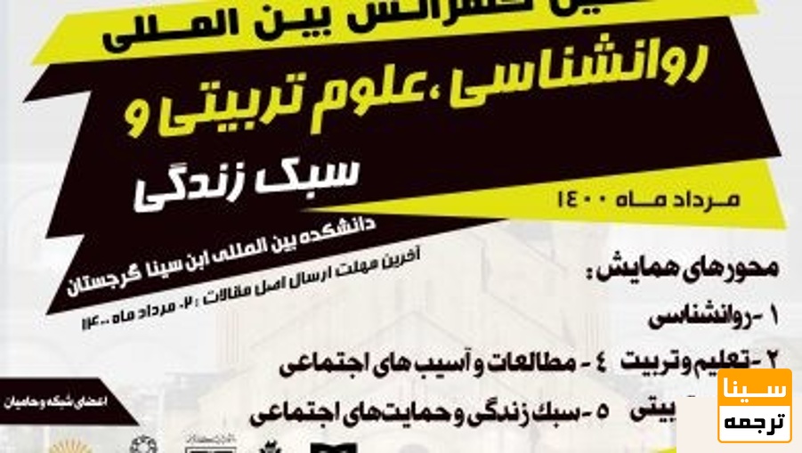سینا ترجمه: هشتمین کنفرانس بین المللی روانشناسی، علوم تربیتی و سبک زندگی روز دوشنبه، 29 شهریور، 1400 توسط شبکه دانشگاههای مجازی جهان اسلام در شهر گرجستان-تفلیس برگزار می شود.